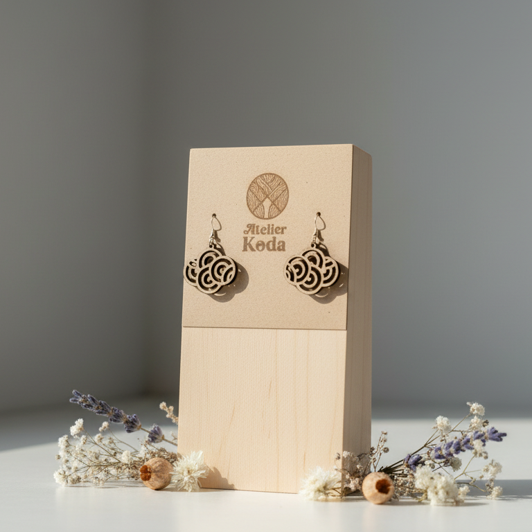 Boucle d’oreille Akatsuki en contreplaqué de peuplier, découpée au laser puis poncée et assemblée à la main. Crochet en Argent 925 hypoallergénique.