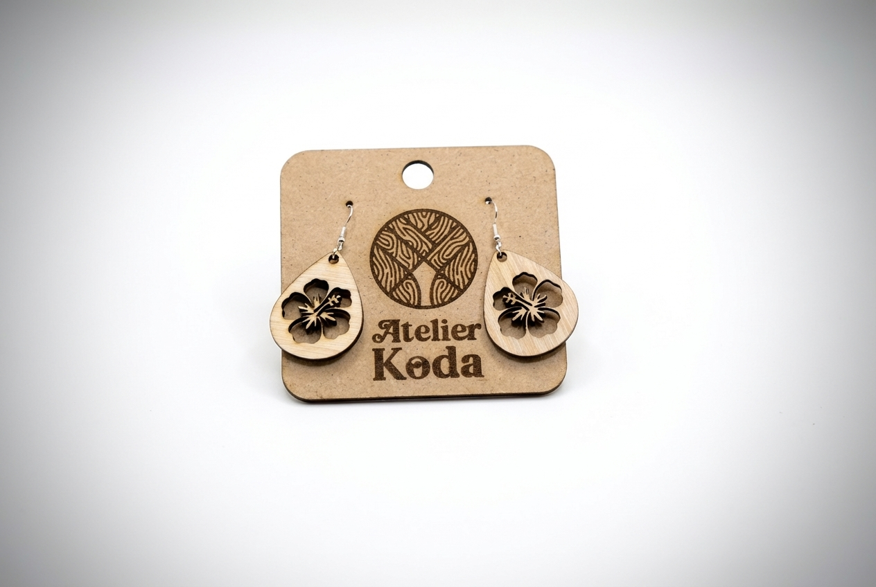 Découpée avec précision au laser dans du contreplaqué de peuplier, chaque boucle révèle des détails fins et harmonieux. Chaque pièce est ensuite poncée et assemblée à la main, garantissant un bijou artisanal unique et soigné.