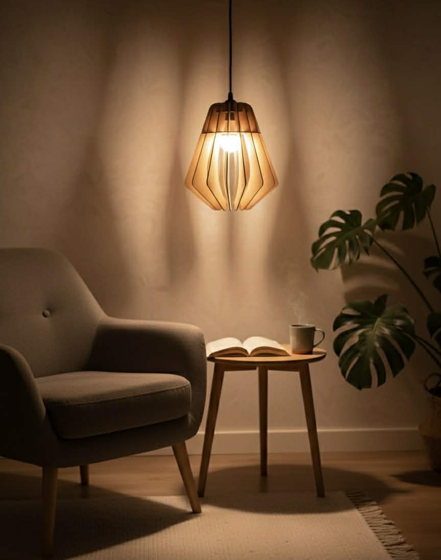 Sa structure en MDF 3 mm, découpée avec précision, forme un abat-jour design aux lignes organiques, rappelant une fleur ou une lanterne japonaise moderne.