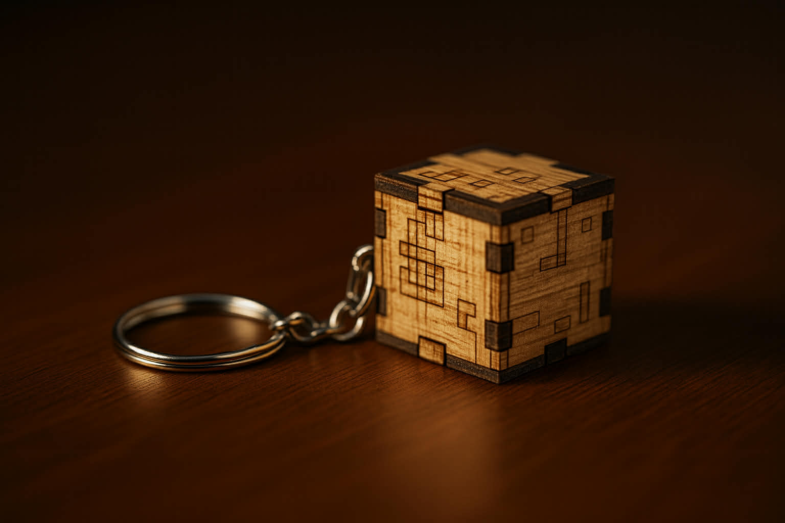 Porte-clés CUBE en bois naturel, gravure laser pixelisée.